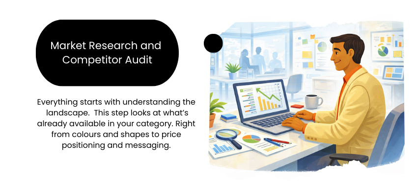 Everything starts with understanding the landscape. This step looks at what’s already available in your category. Right from colours and shapes to price positioning and messaging. The goal isn’t to copy competitors but to identify patterns, gaps, and opportunities. This research will actually help your brands avoid blending in and instead design packaging that feels fresh yet familiar enough to trust!