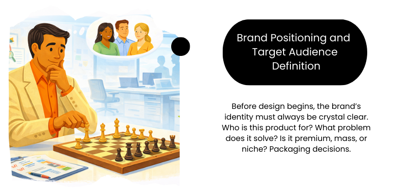 Before design begins, the brand’s identity must always be crystal clear. Who is this product for? What problem does it solve? Is it premium, mass, or niche? Packaging decisions. Right from fonts to finishes. All of it depends heavily on this clarity. When positioning is vague, packaging becomes confused. When positioning is strong, design decisions become easier and more consistent!