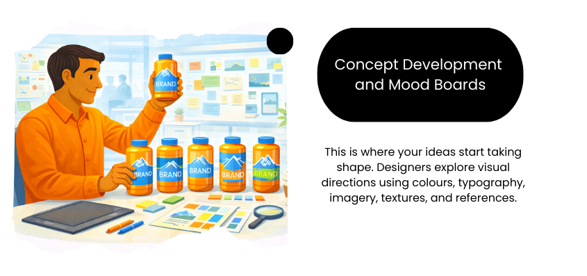 This is where your ideas start taking shape. Designers explore visual directions using colours, typography, imagery, textures, and references. Mood boards surely help align everyone early in the process, ensuring the final design reflects the brand’s personality and goals. It is also a safe space to experiment before committing to final designs.