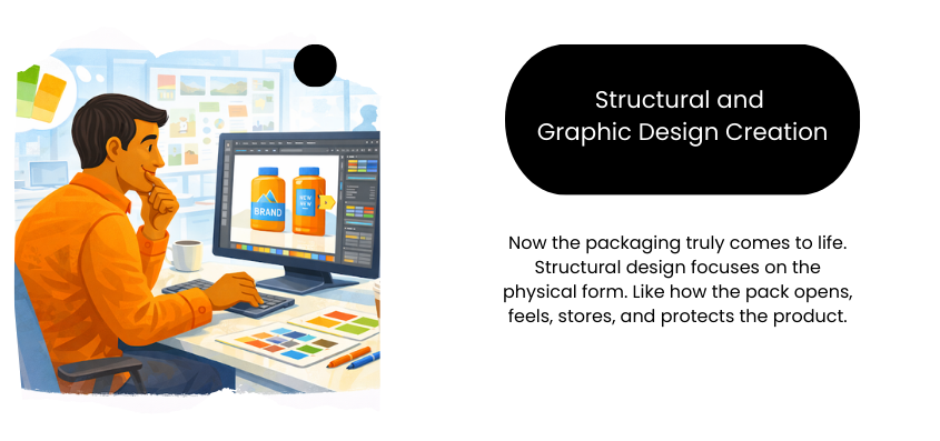 Now the packaging truly comes to life. Structural design focuses on the physical form. Like how the pack opens, feels, stores, and protects the product. Graphic design handles everything visual: layout, branding, information hierarchy, and shelf impact. You need to balance both in the right way. The best designs focus on aesthetics, usability and cost efficiency!