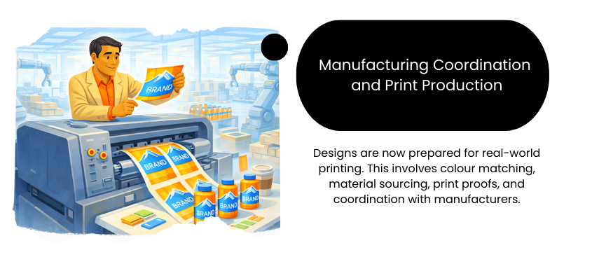Designs are now prepared for real-world printing. This involves colour matching, material sourcing, print proofs, and coordination with manufacturers. A good design team works closely with printers to ensure consistency between what was designed and what gets produced!
